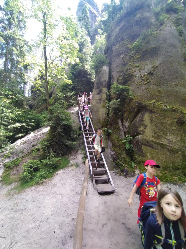 Vyrazili jsme do Adršpašských skal, kde se nám moc líbilo. Prošli jsme turistický okruh skalním městem dlouhý 3,5 km. Po trase jsme hledali skalní útvary, které se snaží vystihnout ve skalních tvarech konkrétní podoby a výjevy. A fantazii jsme měli opravdu pestrou.